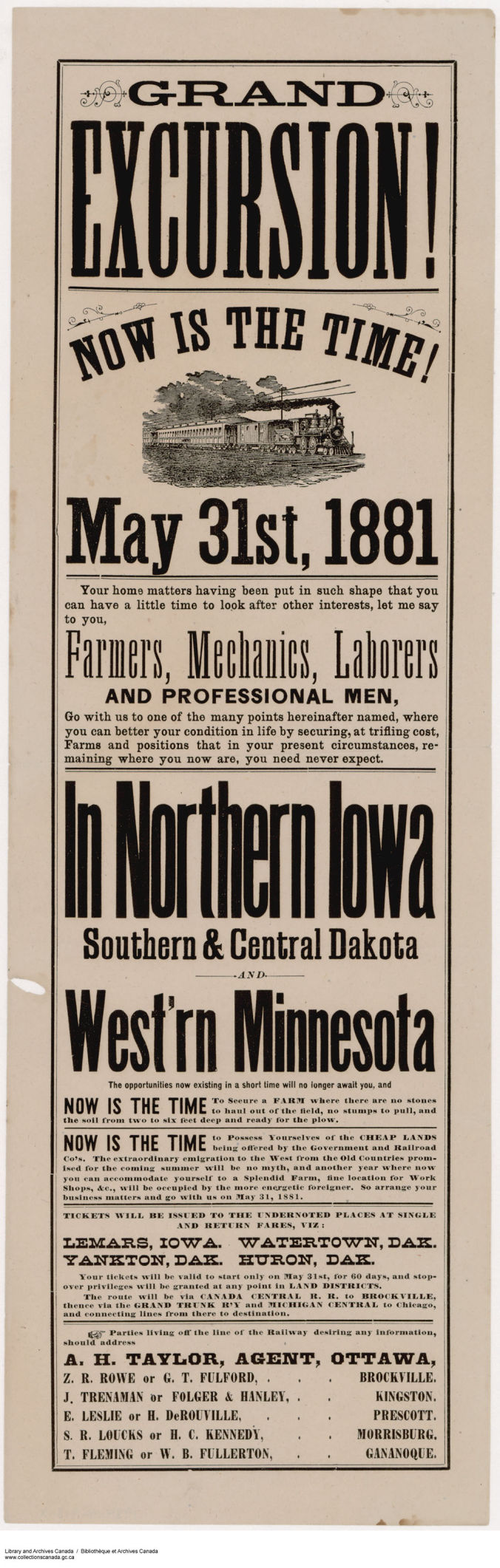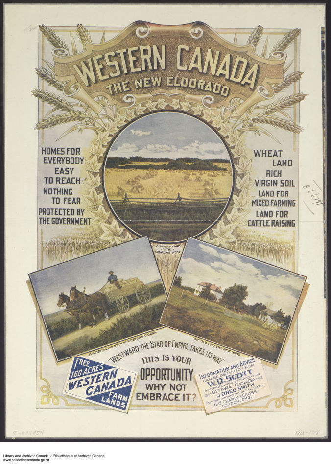 1872 | Ontario | The Dominion Lands Act allowed any male over 21, or any female head of household, to apply for and receive 160 acres of land in Manitoba, Saskatchewan, Alberta, British Columbia or the Northwest Territories. | Western Canada |